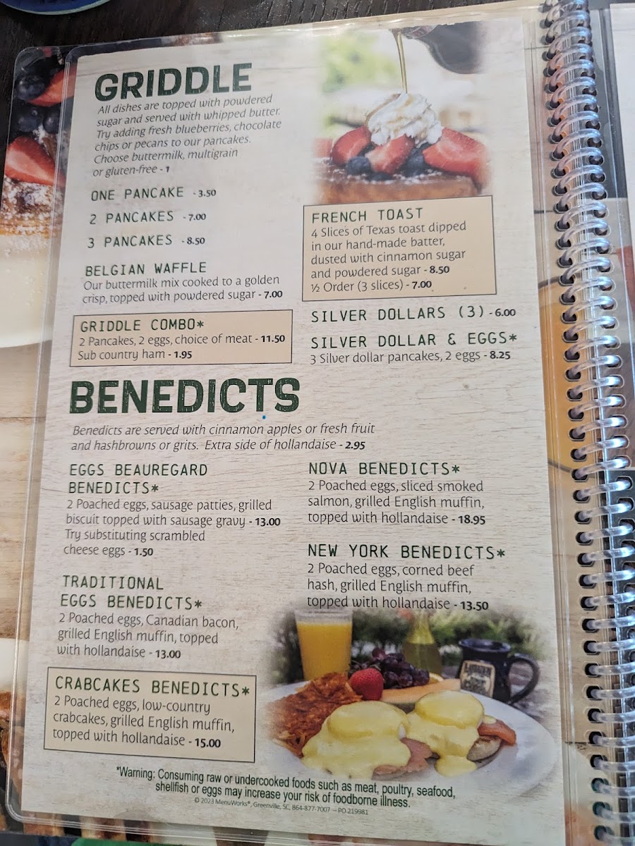 2 Poached eggs, low-country crab cakes, grilled English muffin, topped with hollandaise