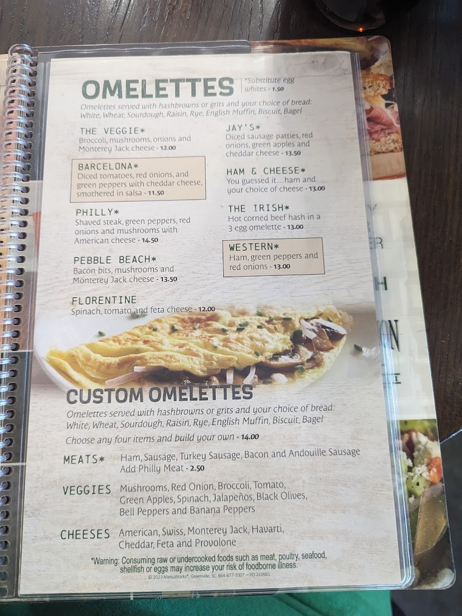 Omelets served with hashbrowns or grits and your choice of bread: white, wheat, sourdough, raisin, rye, English muffin, biscuit, bagel.